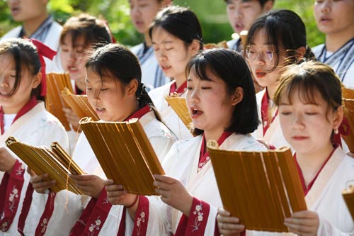 4月20日,在亳州職業技術學院,大學生們身著古裝閱讀各類書籍。當日,學院開展“著古裝 誦經典”迎接4月23日“世界讀書日”活動,營造