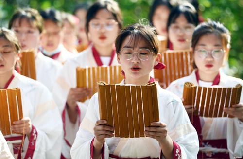 4月20日,在亳州職業技術學院,大學生們身著古裝閱讀各類書籍。當日,學院開展“著古裝 誦經典”迎接4月23日“世界讀書日”活動,營造