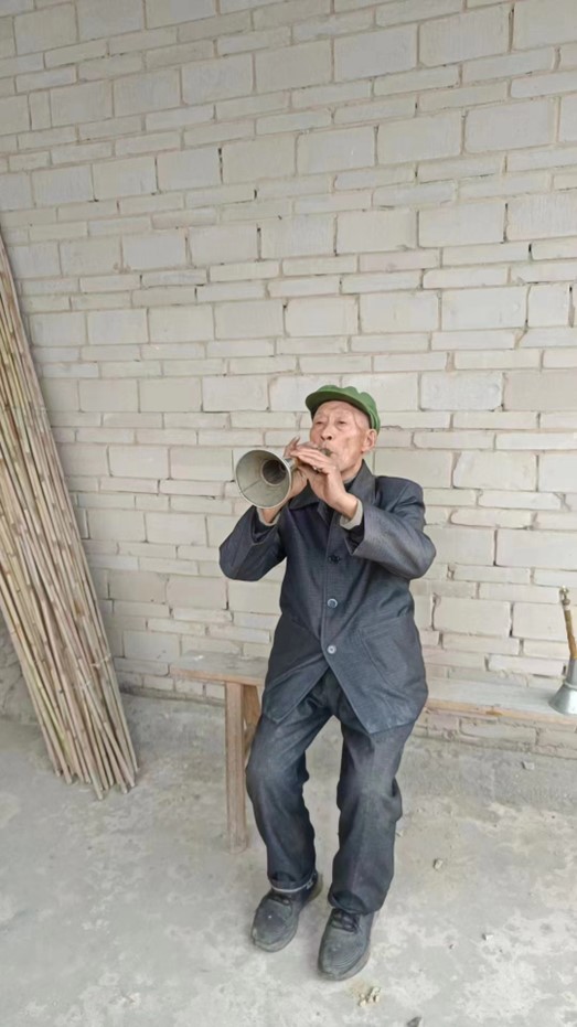 圖為非物質(zhì)文化遺產(chǎn)傳承人冉龍華在進行龍孔吹打表演。 圖片來源:大面場村黨總支部書記冉