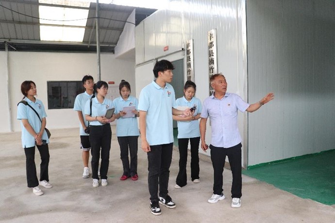 圖為實(shí)踐團(tuán)成員跟隨書記參觀產(chǎn)業(yè)基地。