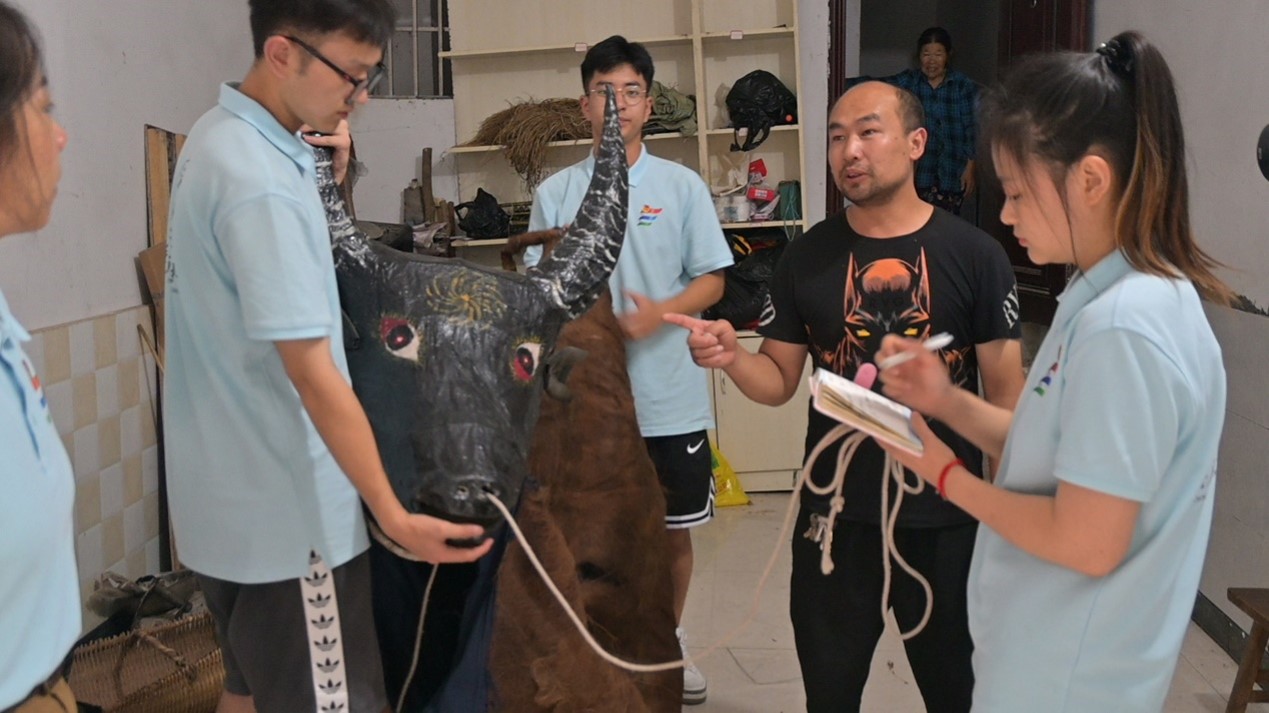 “一般用的音樂就是我們的民間音樂,它有四種樂器嘛,就是大鑼、小鼓,一個(gè)镲子、一個(gè)小鑼,想熱鬧些的話,就加兩把嗩吶。”秦鵬先生不僅為實(shí)踐團(tuán)介紹戲牛舞的配樂,表演形式及內(nèi)容,還邀請實(shí)踐團(tuán)隊(duì)員們親身體驗(yàn),藏入神牛道具中,學(xué)習(xí)戲牛舞的一些表演動(dòng)作。