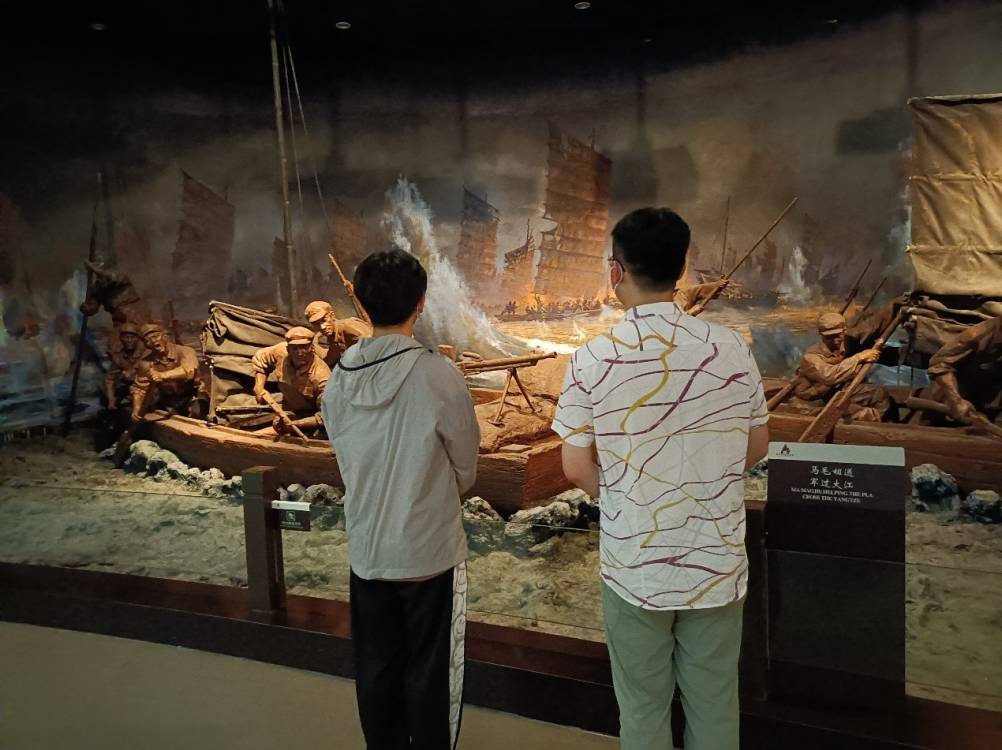 02.渡江戰役篇 我們于次日抵達了渡江戰役紀念館。這里陳列了以渡江戰役進程為主線,包括戰前國內外形勢、戰役的決策和部署、戰役經過、歷史意義,突出展示了中共中央和總前委的運籌帷幄、人民支前等重要內容。 在長江北岸開展戰役的準備工作時,地方各級黨政機關竭盡全力動員和組織廣大人民群眾進行支前工作,根據網上搜集的資料和館內人員的講解,我們得知人民群眾與解放軍戰士們有著千絲萬縷的聯系,據我們熟悉的《馬毛姐送軍過大江》的故事也在此發生。從“百萬雄師過大江”的壯偉畫卷到“全面建成小康社會”的時代巨變,信念一步步變為現實,如今86歲的馬毛姐,既是親歷者又是建設者、貢獻者。歲月如梭,她初心如磐,信念永遠