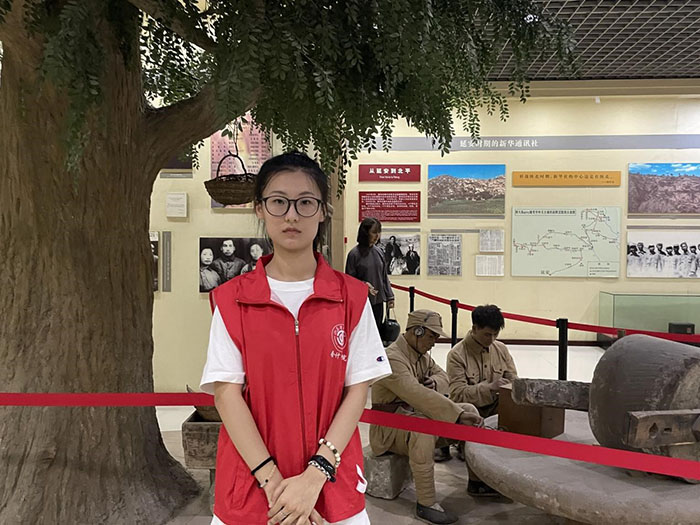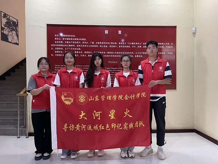 山東管理學院大河星火“賡續黃河紅色文脈·賦能工會百年精神”實踐團隊來到清涼山下的延安新聞紀念館,進入展廳,團隊成員被正中央的雕塑所吸引,石基上鐫刻著延安時期毛澤東主席為廣大新聞工作者的題詞“深入群眾,不尚空談”,這寓意著新中國新聞事業的基石是從延安奠定的。沿著館內樓梯前行,映入團隊成員眼簾的是毛澤東同志和博古同志的雕塑,他們堅定地目視前方,為新聞事業而自信,為解放前途而自信。他們背后陳列的是延安時期新聞事業的偉大成就,團隊成員詳細了解館內展品,這些展品見證了延安時期新聞工作者孜孜不倦完成抄報和翻譯任務,在黨與人民同甘苦、共患難的艱難歲月中,將中國的聲音傳向四面八方。