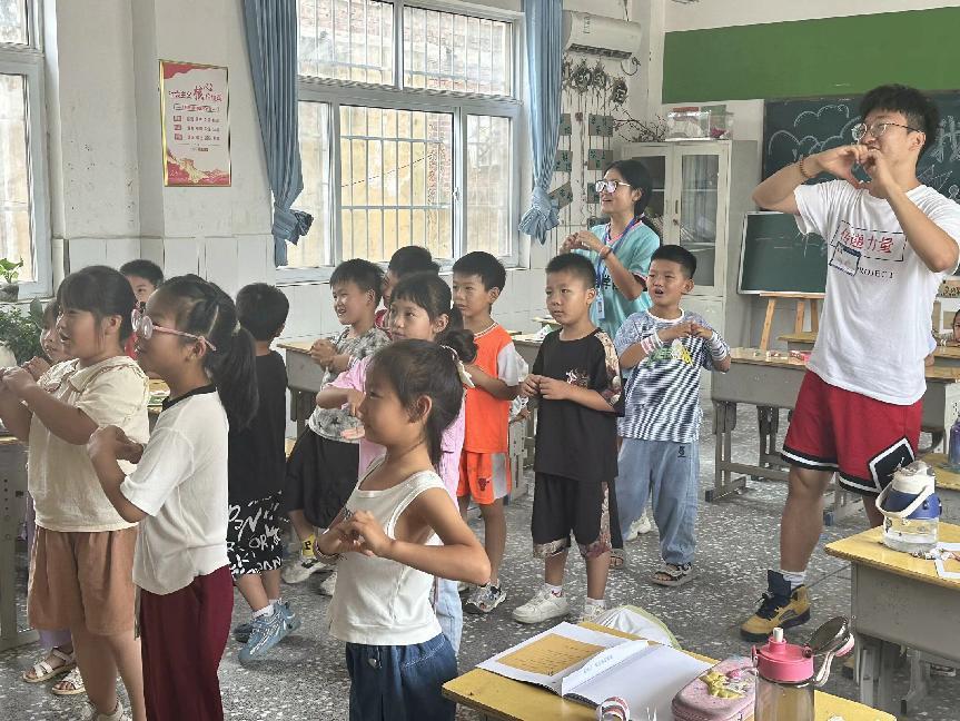 圖片為實踐隊隊員和學生們一起跳手勢舞。中國青年網通訊員 張杰 攝
