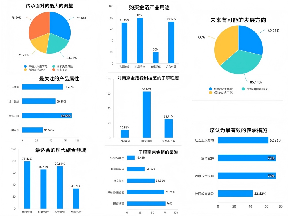 實踐活動伊始,團隊聚焦公眾對南京金箔的認知現(xiàn)狀,精心設計涵蓋了解程度與渠道、產(chǎn)品屬性與用途、工藝與傳承、現(xiàn)代結合與發(fā)展方向以及推廣方式等維度的線上調(diào)查問卷,借助社交媒體平臺、校園社群等多渠道投放,共收集 175 份有效問卷。數(shù)據(jù)顯示,僅 10.86% 的受訪者對南京金箔鍛制技藝了解較多,63.43% 的人略有耳聞,25.71% 的人完全不了解;76% 的人通過書籍或課程了解金箔文化,54.86% 的人通過社交媒體接觸相關信息。這一調(diào)研結果為團隊后續(xù)實踐活動的精準開展提供了科學依據(jù),也凸顯了加強金箔文化普及的迫切性。
