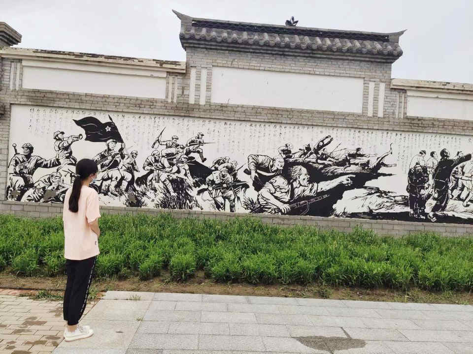 說長垣的黨史離不開趙堤,第一個農村黨支部成立于此;說長垣的抗日史離不開這里,這里發生過小渠抗日阻擊戰和小渠慘案;說長垣的解放史離不開這里,這里是濱河縣委縣政府所在地,被稱為長垣的“西柏坡”……小隊成員對1940年發生過小渠抗日阻擊戰的感受頗深。廣場的正中央是一座“小渠慘案紀念碑”,上方手持武器,時刻警惕敵人的戰斗英雄目光注視著遠處,時刻為戰斗而準備著。廣場盡頭有一幅描述“小渠慘案”的場面,讓小隊成員深刻地感受到戰爭的殘酷和人民的反抗。