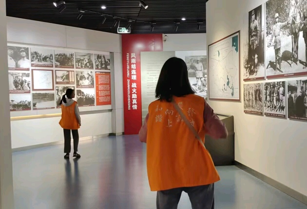 大家隨著游客接著往里面走,看到了走廊上的照片。隊(duì)員們一一向游客們講解照片背后的故事。這張是他組織參加了北京南苑暴動(dòng),成為北京東城區(qū)著名的學(xué)生運(yùn)動(dòng)領(lǐng)袖和地下黨負(fù)責(zé)人后的留影;這張是他參加二萬(wàn)五千里長(zhǎng)征的圖片……