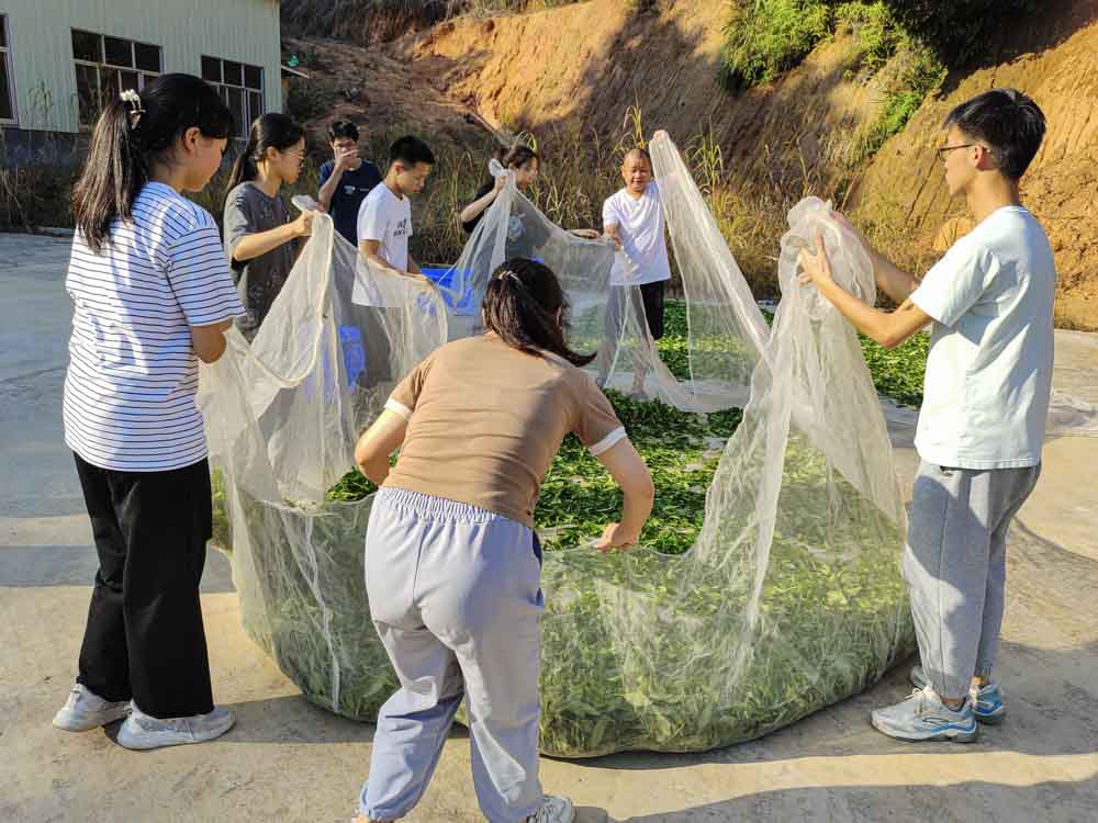 在興寧市農豐水果專業合作社,實踐隊隊員有幸親身體驗了晾青、曬青、搖青、發酵、殺青、揉捻和烘培的制茶全過程,切實感受到半自動生產模式下制茶的不易,了解到夏茶品質較春茶差、香味難以保留以及茶湯硒含量少等問題,對徑南鎮茶葉產業發展問題有了更深層次的認識。