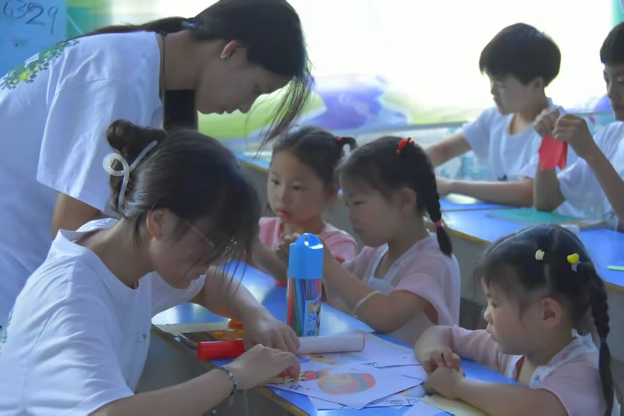 圖為隊員陪同學們折紙。卜祥吉 供圖