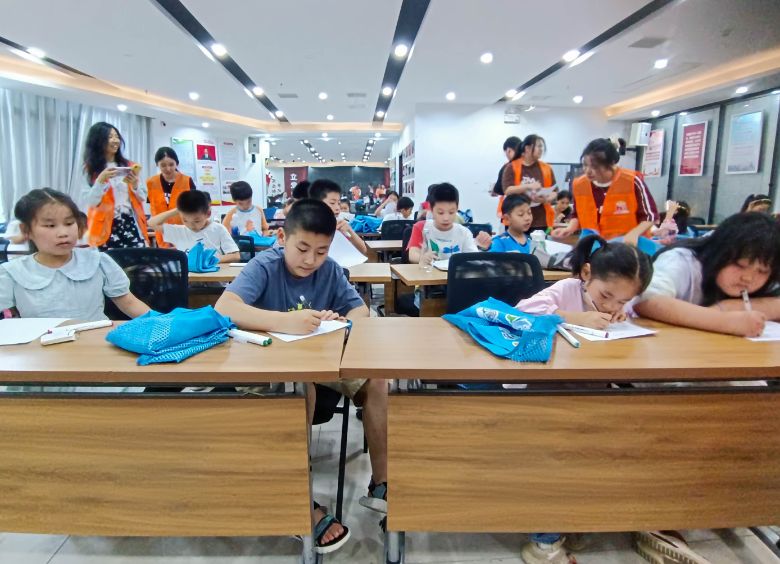 活動(dòng)伊始,朝夕實(shí)踐隊(duì)成員早早抵達(dá)江漢關(guān)社區(qū)黨員群眾服務(wù)中心,與社區(qū)工作人員、公益組織志愿者默契配合,有條不紊地開展前期準(zhǔn)備工作。隊(duì)員們仔細(xì)清點(diǎn)參與活動(dòng)的小朋友人數(shù),逐一核對名單確保無遺漏,并根據(jù)孩子們的身高體型分發(fā)合適的活動(dòng)馬甲,鮮亮的橙色馬甲不僅成為活動(dòng)中的一抹亮色,更寄托著對孩子們的安全守護(hù)。同時(shí),隊(duì)員們協(xié)助布置簽到臺、整理活動(dòng)物資,為活動(dòng)的順利開展筑牢基礎(chǔ)。