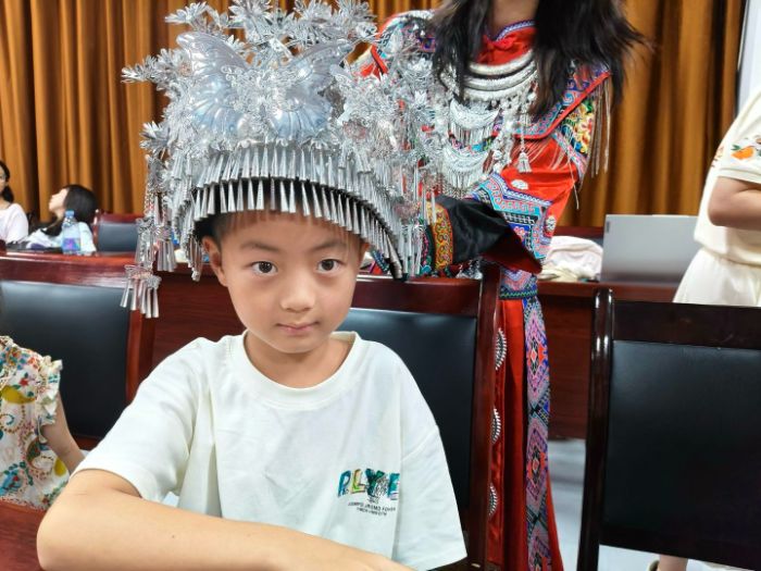 圖為小朋友在隊(duì)員的帶領(lǐng)下佩戴苗冠。張娟 供圖
